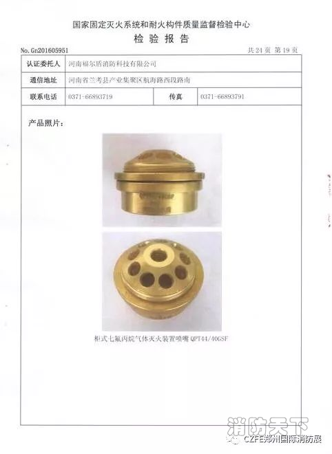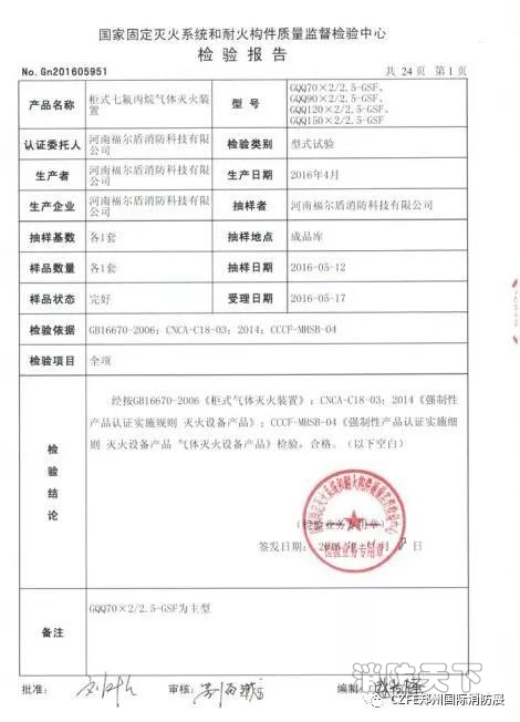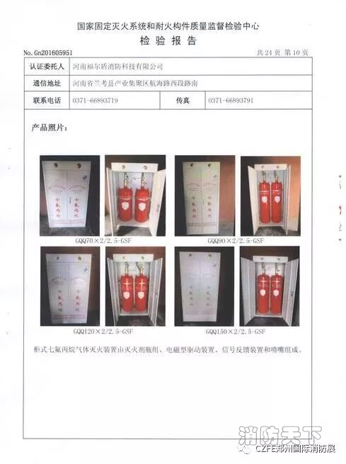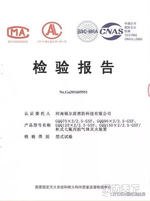 產(chǎn)品已獲得由國家固定滅火系統(tǒng)和耐火構件質量監(jiān)督檢驗中心頒發(fā)的柜式七氟丙烷雙瓶組檢驗報告。此次產(chǎn)品型號分別是GQQ70*2/2.5-GSF、GQQ90*2/2.5-GSF、GQQ120*2/2.5-GSF、GQQ150*2/2.5-GSF/柜式七氟丙烷氣體滅火裝置。