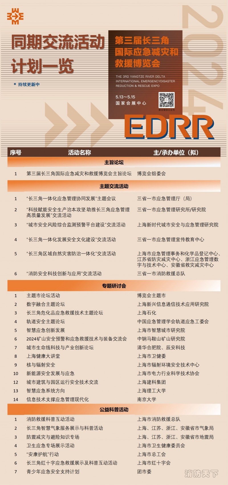 三省一市應急管理廳(局)、消防救援總隊、應急管理研究所/研究院、應急管理宣傳教育中心,上海新時代城市安全與應急管理研究院、上海市應急管理事務和化學品登記中心、江蘇省防災減災中心、浙江應急管理數字與技術中心、安徽省救災減災中心等將于博覽會同期舉辦6場主題交流活動,聚焦應急管理深度發展,規劃長三角一體化應急管理協同發展等主題。